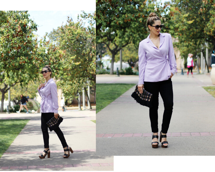 -Los opuestos se atraen: esta ley de la atracción también se aplica a la moda. Para crear contraste entre tus prendas busca los opuestos. Por ejemplo, mezcla negro con blanco, piezas femeninas con aquellas de estilo edgy, combina paletas de color en tonos frios y calidos…. En este caso estoy mezclando un saco en tono pastel y suave con negro para crear un contraste, en lugar de llevar dos tonos suaves o blanco en la parte inferior. Nota como el negro resalta creando un look mas moderno. Una manera muy sencilla de crear contraste es mezclando colores suaves con prendas oscuras.