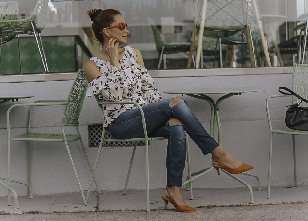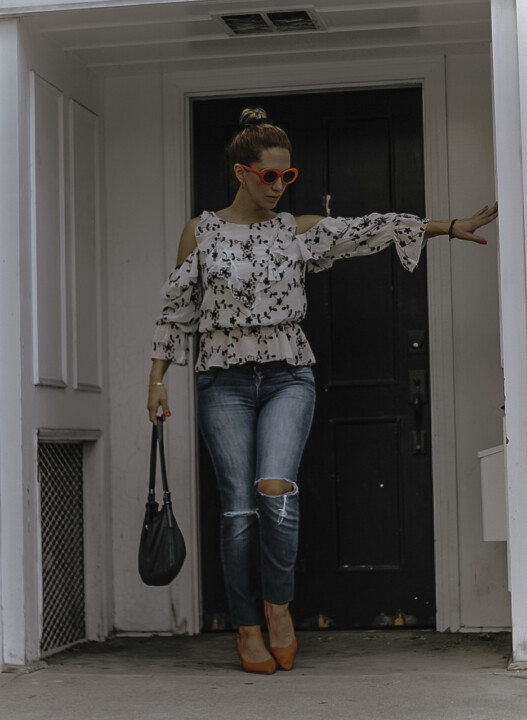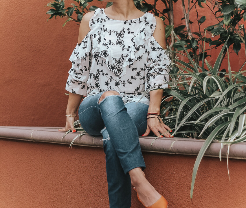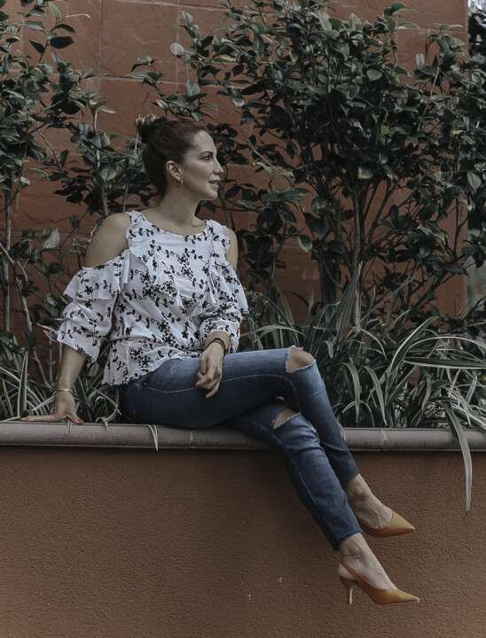 ¿En busca de un poco de inspiración para crear un look casual con jeans? Te traigo un look muy sencillo pero que cuenta con los elementos para crear un combo comodo sin perder el estilo. Un simple par de jeans razgados en la rodilla con un top de olanes, los cuales son el detalle que da ese toque chic al conjunto entero.
