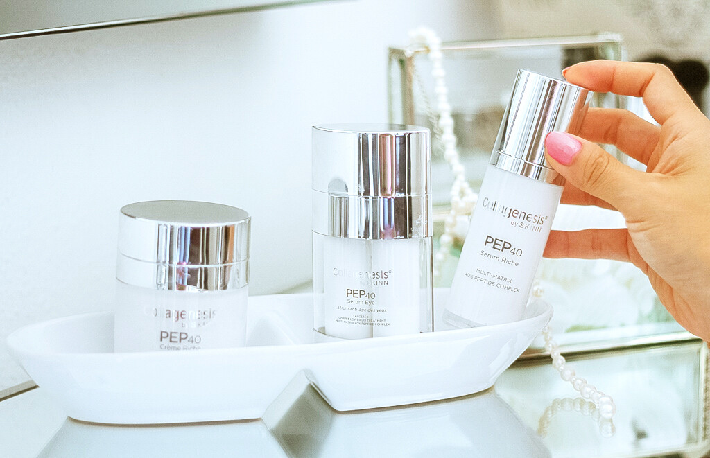 Since the beginning of my career as a Fashion Consultant and beauty advisor, I’ve always had the dream to launch my own skin care line. In order to pursue my dream, I love studying and testing powerful, but most importantly, effective ingredients to help revert signs of aging, and improve the quality and texture of the skin. At this stage of my life, I’m more focused on anti-aging products, to maintain a youthful appearance. And science has proven that peptides, which you’ve probably heard about, are extremely helpful to diminish and manage wrinkles and encourage the collagen production. And you know what? Skinn Cosmetics PEP40 line is ultra rich in powerful peptides! To be more precise a 40% active peptide blend (that’s where their name, PEP40, comes from) along with natural ingredients and vitamins that promote elasticity and deeply nourish the skin.