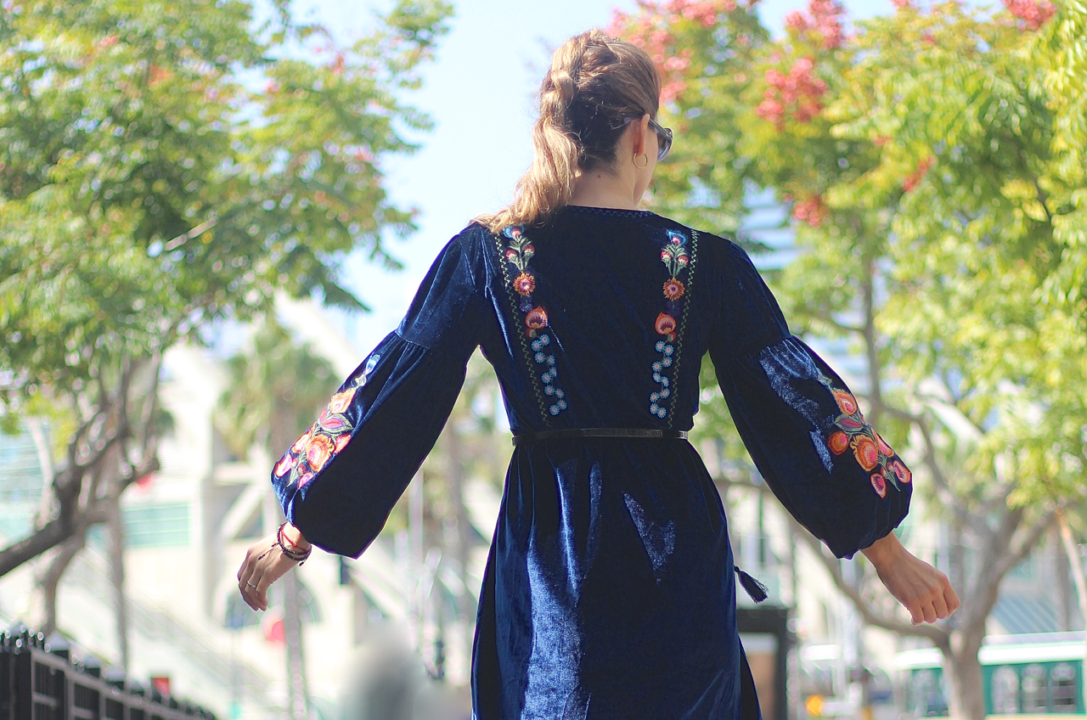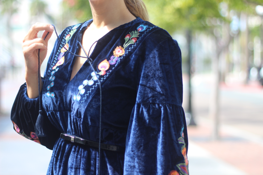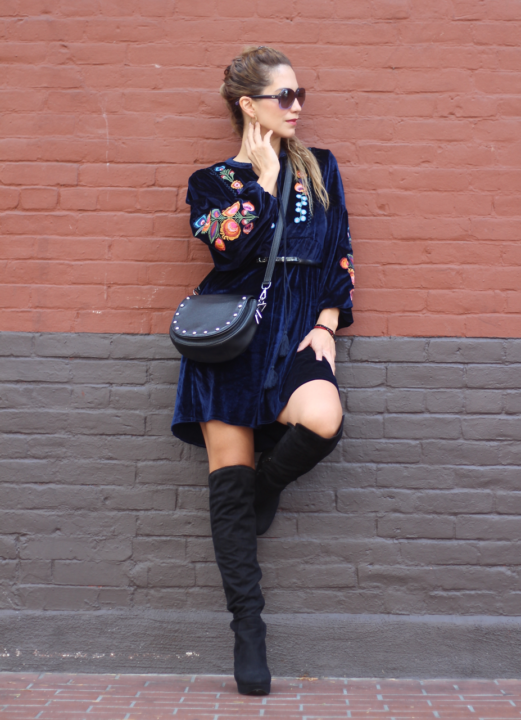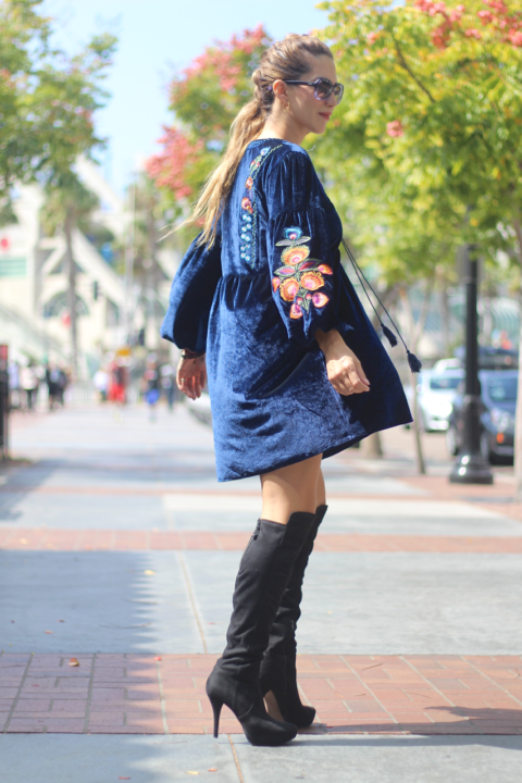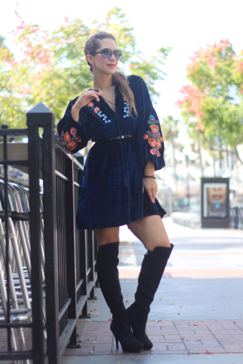 However, I wore this long sleeve velvet dress a couple of weeks ago when we had one of those crazy cold days out of the blue. It’s a fact that floral embroidered clothing, always adds a feminine touch to any look and having those beautiful and girly details on a dress gives a degree of elegance to it. Plus, it’s adorable! This dress is made of velvet, one of the most perfect fabrics to transition into cooler months. Both details, embroidery + velvet are one of the current trends that add a luxurious and girly vibe to any garment. It has a tassel tie neck and embroidered details on its sleeves and front and you can wear this dress from day-to-night and from casual to elegant by simply adding different kinds of shoewear and complements. I went with these over the knee boots because I couldn’t miss the opportunity to wear them. It also fits comfortably and relaxed because of its tunic style or oversize. So, if you’re just starting off your fall-winter wardrobe and you want to look trendy, chic and feminine, a velvet embroidered dress will certainly help you achieve your goal.