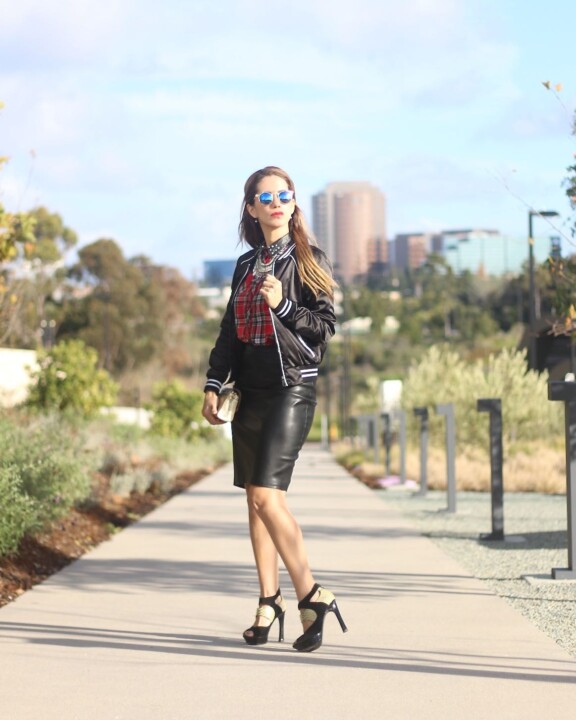 Cute flannels with this print are totally must have for the season, very easy to style. This kind of pattern on a shirt or dress has become super popular. So if you need some inspo or plaid shirt outfit ideas you can copy my look. It’s trendy and chic at the same time. It was ensemble around this shirt, a casual piece but wearing it with a pencil skirt adds instant polish to your entire look. To make my outfit a little more put together, I threw a cool bomber over it and a statement necklace which definitely makes this look even more cool and chic. Could be risky, you’ll probably think that a big accessory could be too much, but in this case, I’m breaking the rules creating an edgy and put together ensemble.