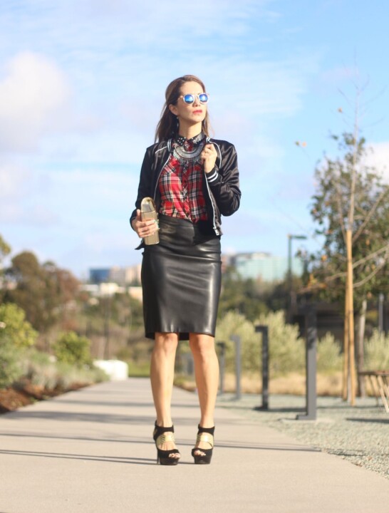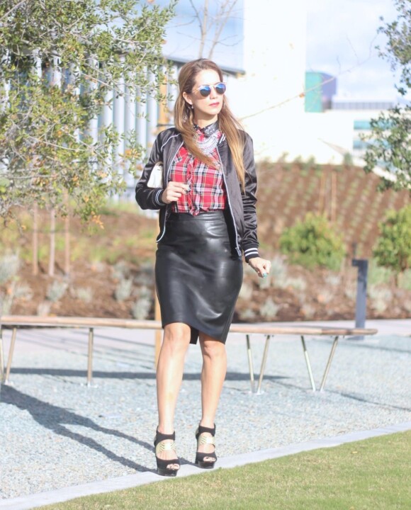 La camisa de tartán es totalmente un básico de la temporada, muy fácil de llevar. Es una pieza casual pero al llevarla con una falda lapiz, como en este caso, se añade un toque elegante. Con una linda chamarra bomber y un llamativo collar resaltamos el conjunto haciendolo definitivamente más cool! Posiblemente pensarás que un accesorio tan llamativo como el collar puede resultar demasiado, pero en este caso estoy rompiendo la reglas, haciendo mi outfit mas divertido.