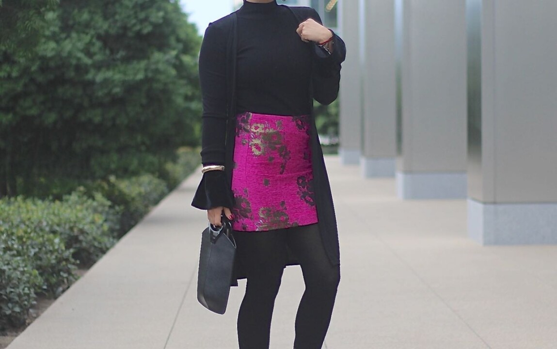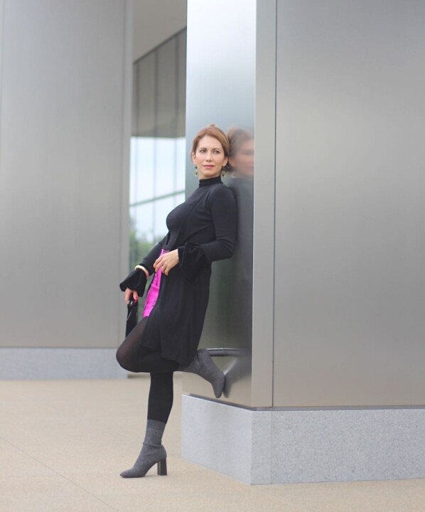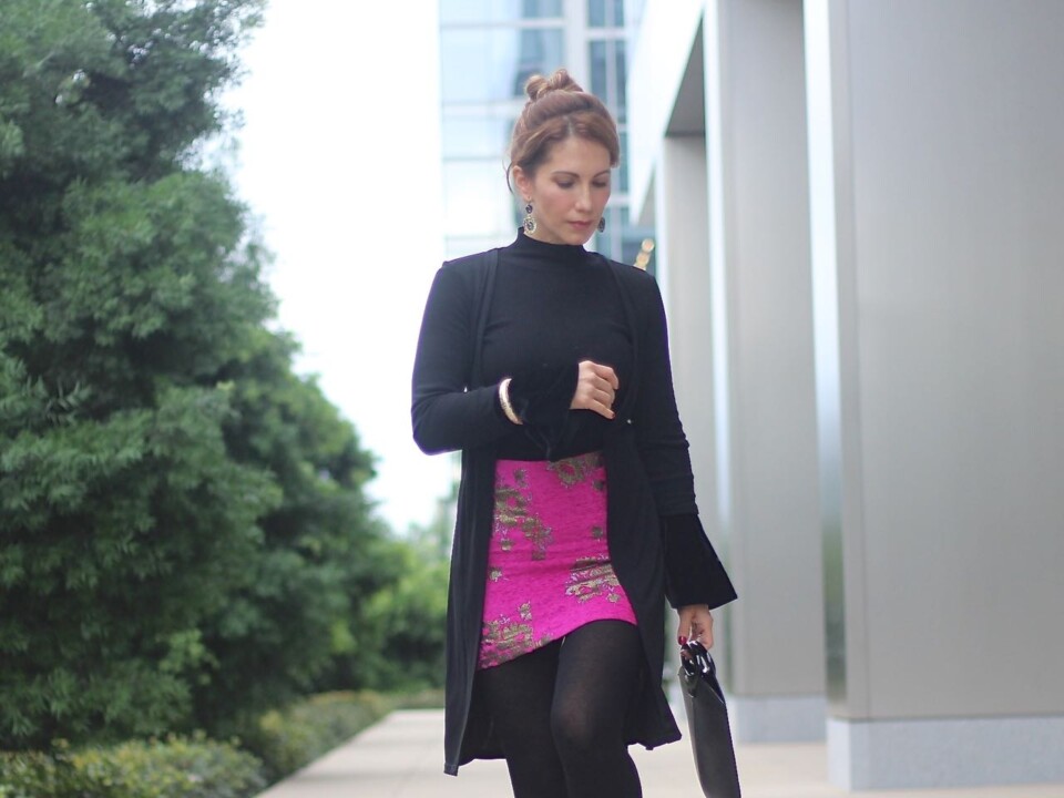 Este outfit lo lleve precisamente en uno de esos dias frescos cuando abrigarse era totalmente necesario. Precisamente ese era mi objetivo al elegir mi vestmenta para mis actividades del dia, sentirme abrigada y lucir con estilo a la vez. Opte por un look monocromático con un toque vibrante de color, al llevar una blusa con mangas de campana con una mini en rosa con detalles metalicos. Esta llamativa prenda añade un boom! a tu look, ademas de ser versatil porque puedes perfectamente llevarla durante primavera-verano y como puedes ver tambien durante otoño-invierno, simplemente incorporando botas y mallas. Lucirás chic y con la dosis perfecta de interes visual, ademas de que te sentirás abrigada. Considera que si eres petite o tus piernas son cortas, sera mejor optar por botas o zapatos negros, con el fin de crear la ilusion optica de alargamiento y hacer que tus piernas luzcan mas largas de lo que son en realidad.