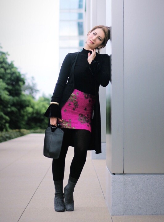 This was one of those cold days when bundling up to stay warm is needed. So that was my goal with this look, staying warm and yet stylish at the same time. I wore a monochromatic look with a pop of color by wearing a nice bell sleeves top paired with a vibrant pink skirt with metallic details. This is a statement piece that adds a crisp touch to your outfit and it’s also versatile because it’s perfect to wear during spring-summer and as you can see, during fall-winter, by simply adding tights and boots. You’ll look chic and your look will have the perfect dose of visual interest. Plus you’ll be warm! keep in mind that if you are petite or your legs are short, it’ll be better to choose black boots or shoes instead, in order to create the optical ilusion of height, elongating your legs.