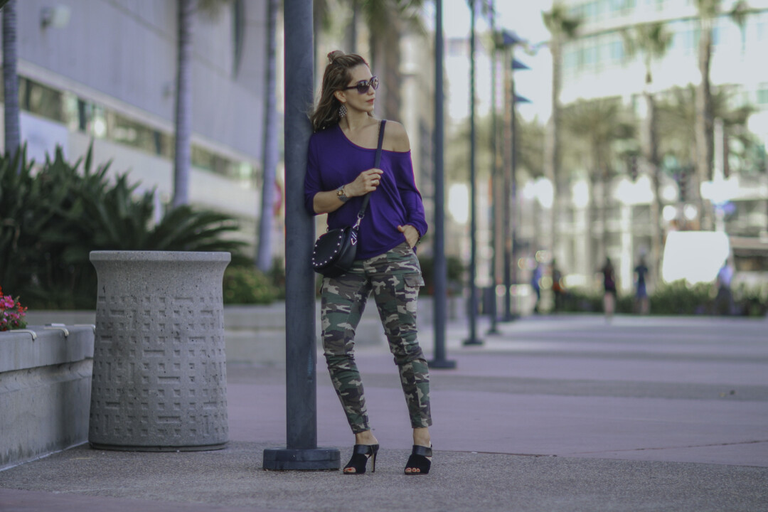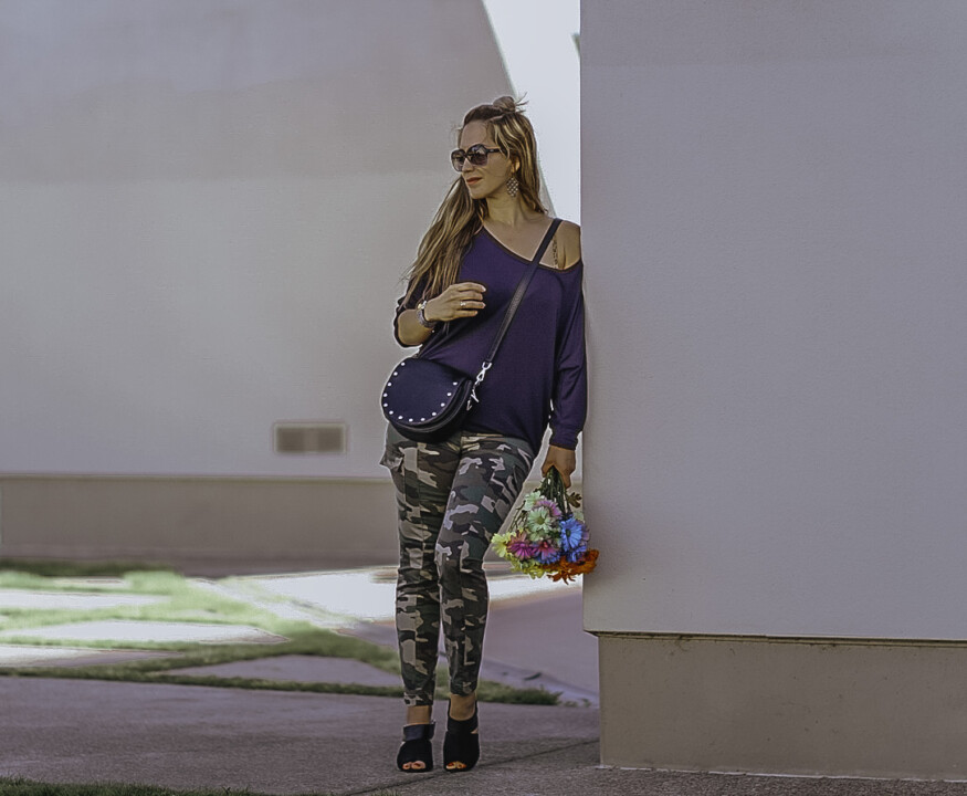 Me encanta todo tipo de estampado de camouflage y decidi dar vida a estos pantalones estilo cargo, llevandolos con un top en color morado, ultra violet. Literalmente me estoy enamoramndo de este tono, porque al verlo por todos lados, de la pasarela a las calles e inclusive en elementos decorativos, terminé amándolo. Por lo que de ahora en adelante me veras llevandolo mucho. En esta ocasion fue todo acerca de un look casual pero me encantaria llevar un lindo vestido, o traje en este tono, pero bueno, lo haré y por supuesto lo compartire con ustedes. Ya que como algun@s de ustedes ya saben, me encanta incorporar y mezclar colores para hacer mis looks divertidos y que luzcan con estilo.