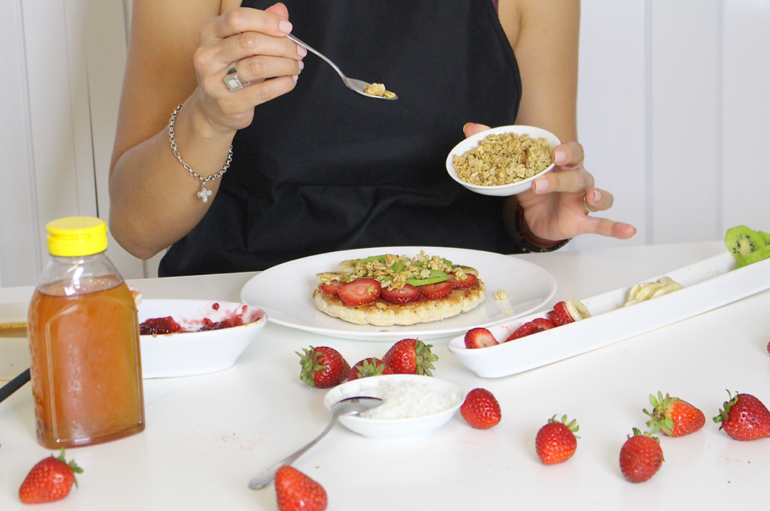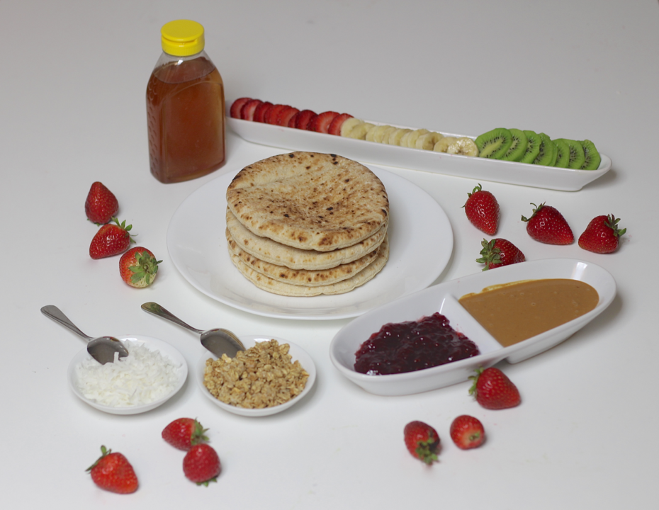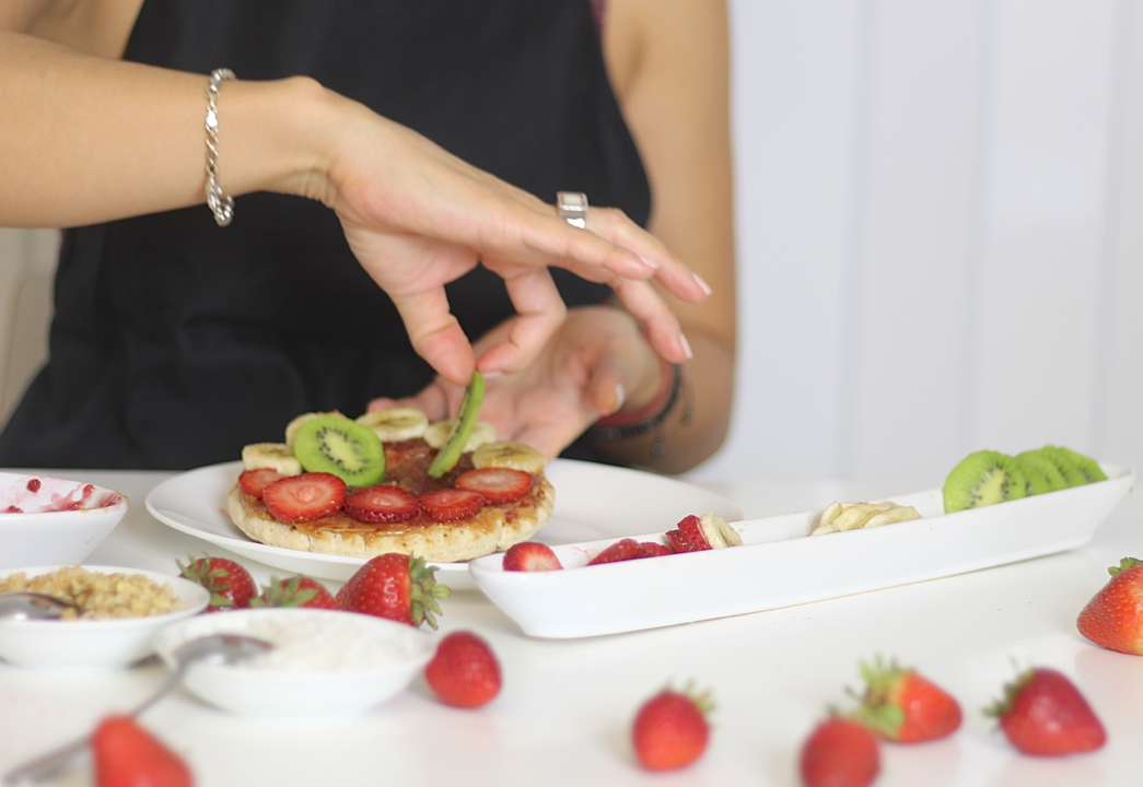 Como puedes ver, te estoy dando una lista de diversos ingredientes que puedes usar. Comienza eligiendo tu base, en mi caso opte por pan pita porque se que a mis hijos les encanta. Posteriormente los puse en el tostador por unos minutitos para que esten calientitos por dentro. En mi familia somos fans de la crema de cacahuate con mermelada asi que esta mezcla fue la perfecta para elaborar mis pizzas de fruta. Simplemente unte en el pan crema de cacahuate, mermelada y despues de decidirme que frutas añadir, lo cual me tomo un tiempo, porque hay gran variedad de donde escoger para la elaboración de esta receta. Me decidí por algunas frutas frescas con las que contaba en casa: kiwis, fresas y plátano. Finalmente agregue un toque muy dulce con granola, coco rayado y miel. Y saben que? ¡Quedo listísimo!