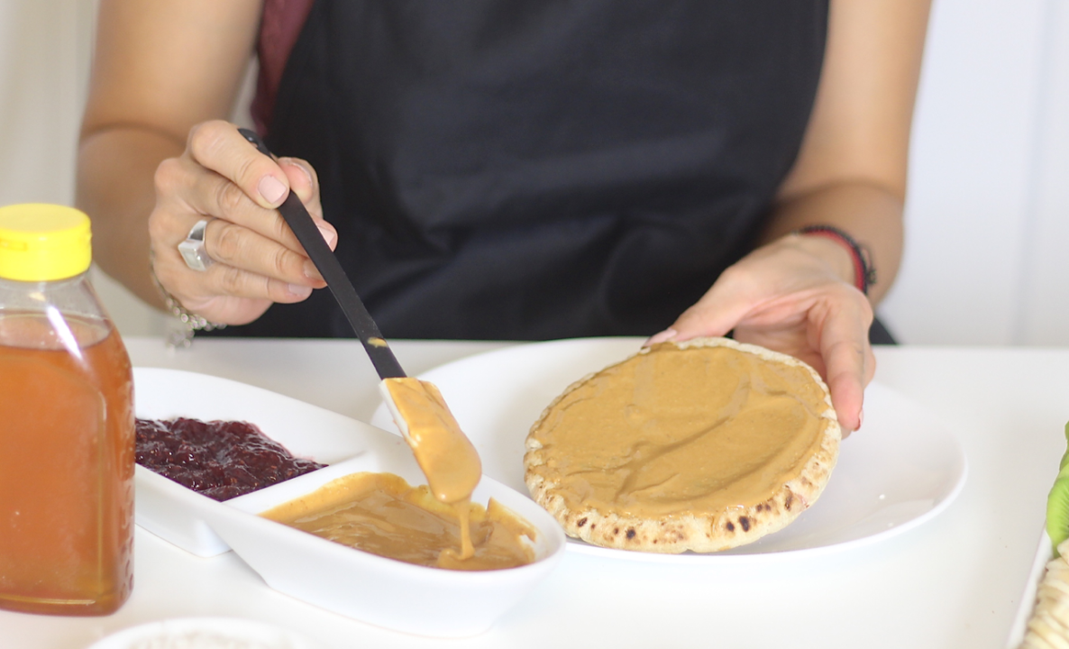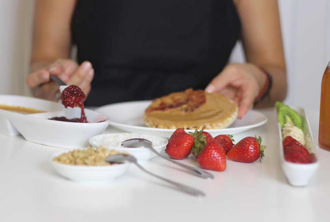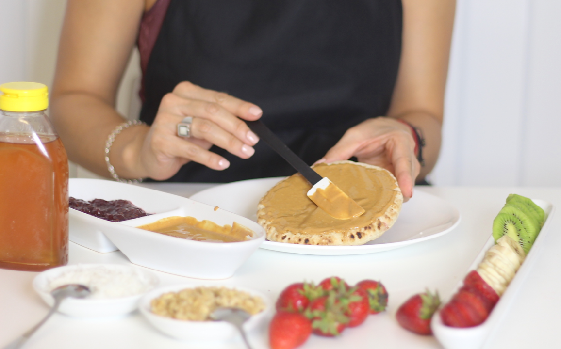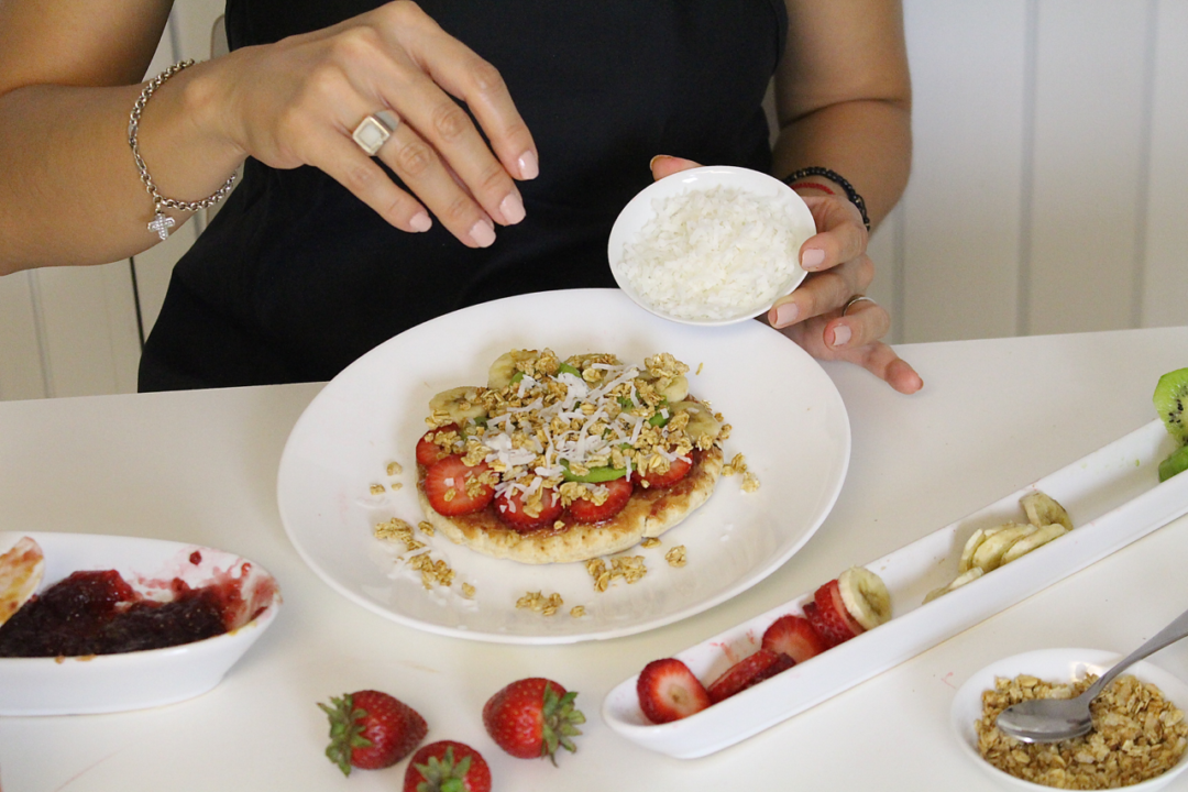 As you can see, I have provided you with a list of various ingredients that you can use! Start out by choosing your crust, in my case I decided to use some pita bread because it’s something I know my kids love. This step is really up to you, but I decided to put my pita breads in the toaster for a few minutes just so they could get a little warm on the inside. We are honestly some of the biggest fans of peanut butter and jelly so I wanted to recreate that same concept for this fruit pizza. I took some natural peanut butter and raspberry jam and spread it on top of my crust. Not going to lie, choosing my toppings was certainly difficult because there are so many different and delicious suggestions to choose from. But I finally decided to go with some fresh fruit, kiwis, strawberries, and bananas. Then I wanted to add a sweet touch to it so I sprinkled some granola, shredded coconut, and raw honey, and guess what?! You’re done!