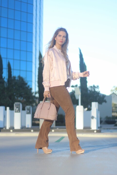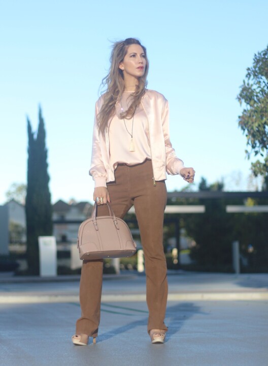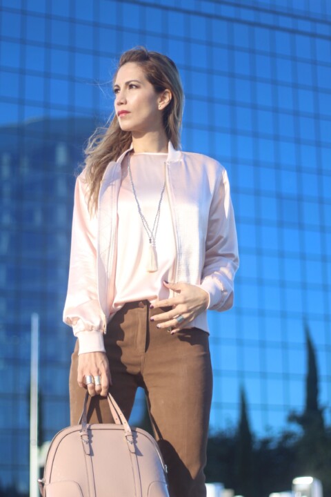 Today I’m restyling old pieces from my wardrobe, wearing a sweet combination head to toe. If you have been following my blog for a while, I am pretty sure you have noticed my love for feminine clothing. This is a look from Carlisle collection, it consists of a blush color top layer under a bomber jacket, which adds an incredible and pretty touch to the entire look. Since I bought it I decided that it would be one of my go-to pieces, because of its versatility. On the bottom, a pair of suede pants, totally chic! They create a flattering silhouette and add a luxe touch to my combo. So, If you are looking for brown dress pants, these are a great option.