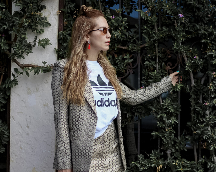 I styled my logo t-shirt in a suited look to create something more refined, but you can also wear a logo t-shirt with jeans, shorts, or even with pants. Grab your chunky sneakers, and you’ll have a chic sporty look. Invest in some simple pieces to rock the logomania trend. You will be surprised by how easy is to incorporate them into your daily outfits. Even t-shirts could make a big impact on your wardrobe. I also encourage to take a look at your mother’s, boyfriend’s, and even brother’s closet. I assure you will find a cool logo t-shirt to build your look.