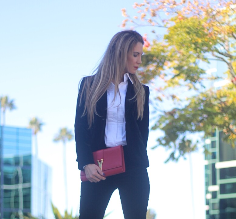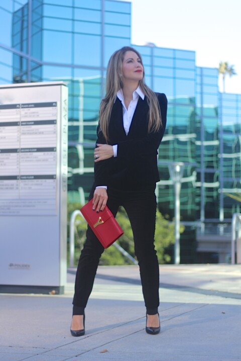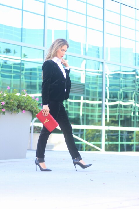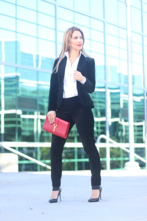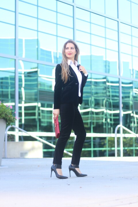 I wore this outfit last night, New Year’s Eve. I love this combo because velvet is simply perfect to wear during the season and it’s also versatile beyond the holidays. I bought this velvet pieces separated and created this suited look, so you can perfectly pair the blazer with different garments and same with the pants. Velvet is one of the strongest trends during this year. A statement piece for Fall-Winter. I wore it with a structured white shirt, very elegant. So in love with the cut and tuxedo styling.