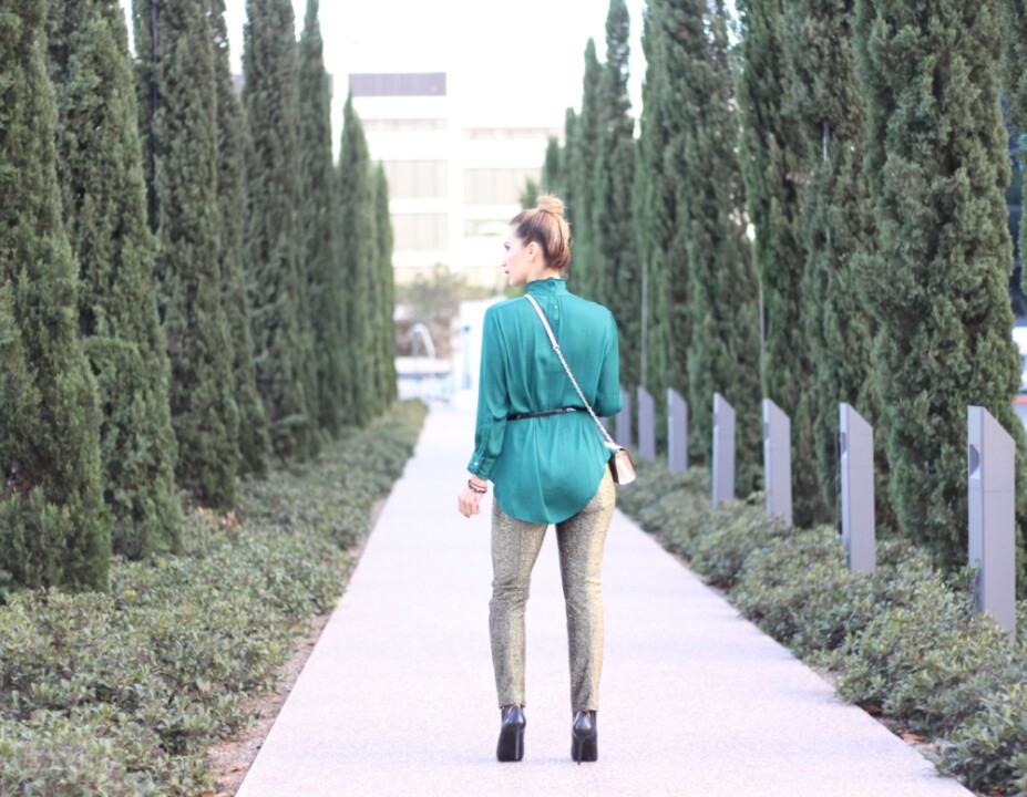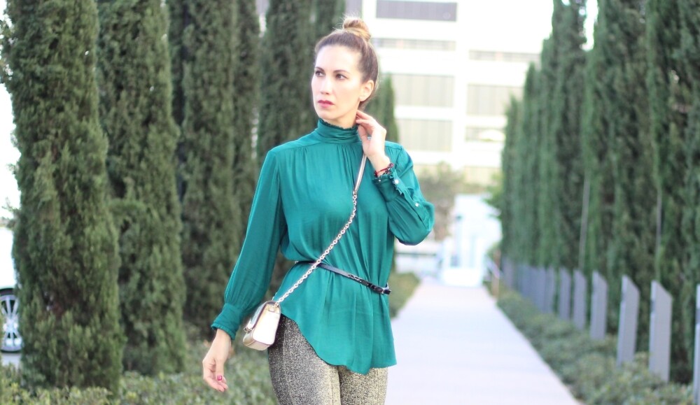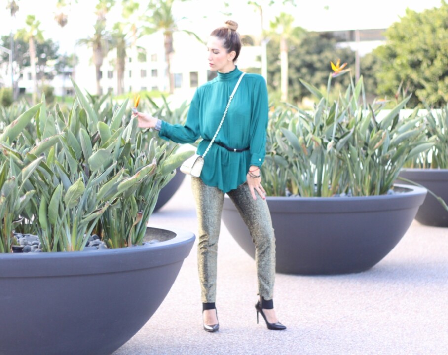We are immerse into Fall so it’s the perfect time to start wearing metallics. Along with the blouse, I decided to incorporate this metallic party pants, love the modern touch that result when pairing these pieces together. Metallic garments are incredible, so fun and great to add visual interest to your looks!