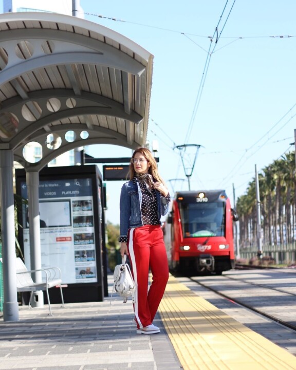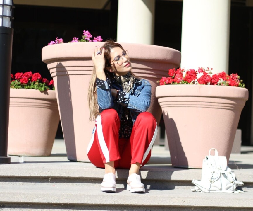 I chose comfy clothes that can perfectly work for a walk in the park, a casual lunch with your friends/boyfriend, a movie night, or even picking up takeout for yourself. If your purpose is to look relaxed and super comfy at the same time, then sporty chic outfits are certainly for you. I paired a cool pair of track pants, with a polka dot shirt and an animal printed scarf. It totally depends on the weather in your area but since today was windy I just layered a basic denim jacket on top. I love the contrast between all these pieces and these styles of pants are totally on-trend, perfect to add a great dose of effortless vibes to your look. I promise you will look like it took time to put this look together when it was just a matter of fact of matching some simple pieces to create this comfy and chic outfit. Keep in mind that jogger pants can also do the job when ensembling a similar combo.