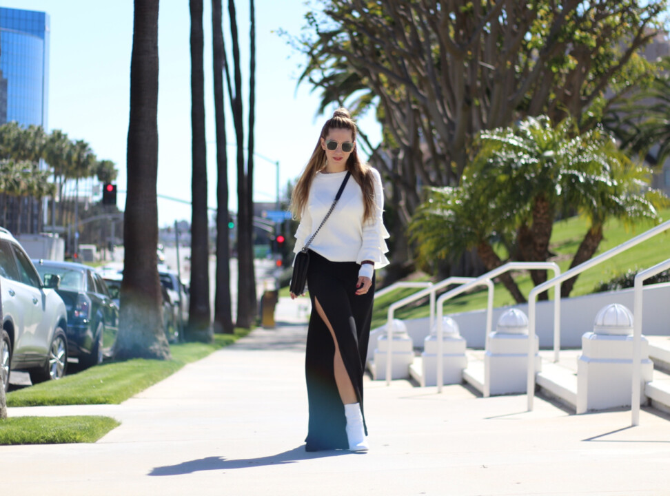 But the chilly days are still here, so that’s why I would like to share the outfit I wore a couple of days ago, a simple black and white combo with a twist. You are probably aware that talking in terms of timeless fashion, this combination is a classic style because it’s always easy and pulled together, great for every occasion. I decided to pair two statement pieces, top and bottom, in order to take it to the next level. Both pieces are so chic, with a great design that adds visual interest to each one. Just take a look at the pretty sweater, its tiered-ruffle trims make this piece modern, yet feminine and romantic. It’s so stylish and classic at the same time, a timeless sweater, very easy to style with different bottom halves all year round. This is a great example of the fact that you don’t need to wear pink or pastels to show your feminine side. You can also pair it with edgy pieces and it will look amazing! I paired my sweater with another statement piece to simply create that wow factor and it was mission accomplished because every step I took someone complemented me regarding my pants. The reason is easy to find because the open slits on the side is an eye-catching element that makes these split-leg pants even more chic and unique. I want to emphasize that wide leg pants make your legs look a mile long giving you a taller and slimmer look. Isn’t this a great reason to wear this style?! They are super flattering.
