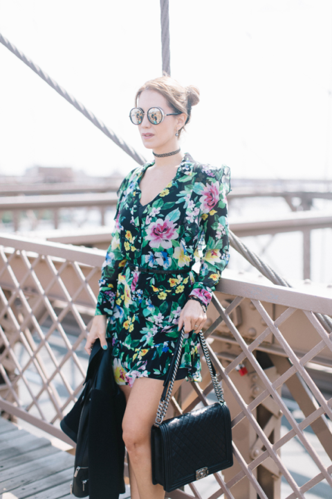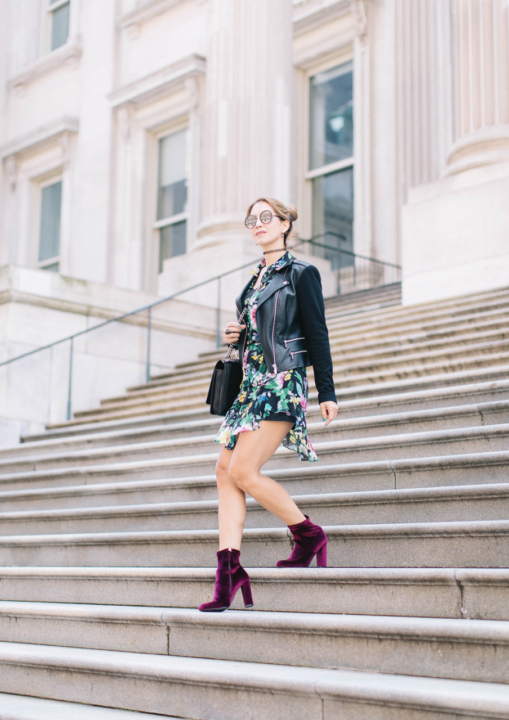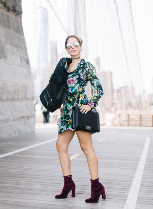 My look is about a beautiful floral dress with an airy fabric and delicate ruffle details. It’s basically two pieces: a slip and a shell, to avoid see through since it’s a thin fabric. It is completely sheer. Think of a floral dress as a good investment because it’s a garment that you can use all year-long during any season. It depends on the way you style it. Of course, during spring-summer, no jacket is needed and as shoewear, strappy sandals work perfectly. Then, you can easily convert this piece into a fall-winter one by just adding layers. A cool jacket or coat paired with any type of boots will make the difference. You can also incorporate tights and you will look so stylish and chic. So don’t you think that’s more than enough to consider a printed floral dress a versatile garment? Plus, it’s very easy to style for a formal event or any occasion. I decided to wear it with a leather jacket and booties to make my combo totally flirty and feminine with an edgy touch. That way it looks more fashionable, according to the activities I had that day during NYFW.