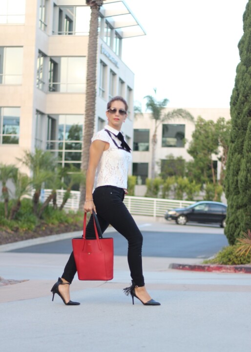 There’s no fails when matching white with black, but I added a pop of color with my red tote and remember that sexy heels can definitely elevate any look!