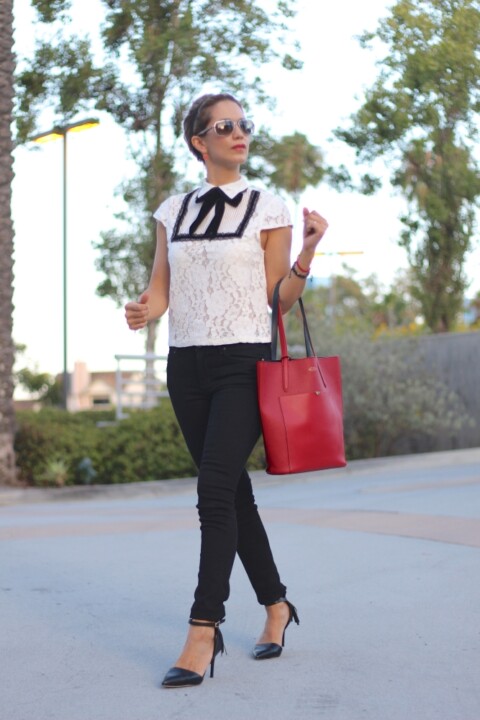 El dia de hoy regreso a los básicos con esta clásica combinación en blanco y negro, a la cual le añadí un lindo toque con esta blusa de encaje y el detalle del moño. Esta blusa es una invitación para todas aquellas chicas femeninas a quienes les gusta llevar toques delicados en sus looks. ¡Yo soy una de ellas! 🙂 saben cuánto adoro este tipo de dulces y lindos acentos para resaltar mis looks.