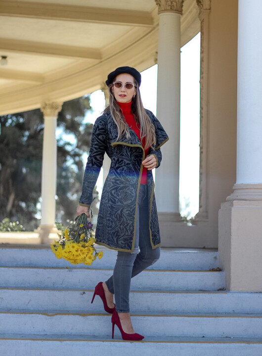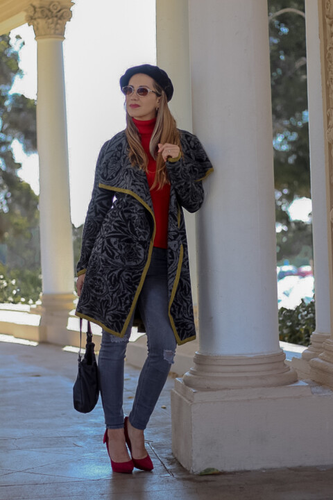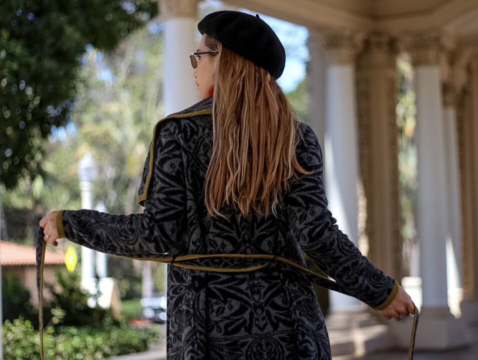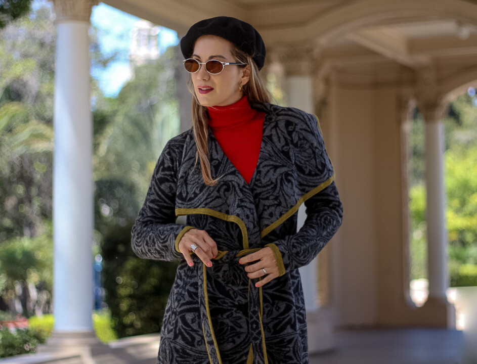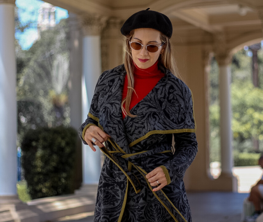 Its draped collar detail makes this piece special. It’s extremely versatile to wear during the cold months. I decided to pair it with jeans and a red turtleneck to add a pop of color to my ensemble and the result was a chic and stylish outfit that received tons of compliments. You can easily dress this knit sweater coat up by wearing any kind of bottoms, according to the occasion, such as trousers, pencil or leather skirt, high boots, etcetera. Notice that it has a belt, which you can tie up front or on the back. I especially love wearing it this way! Or you can even wear it without the belt. It’s totally optional.