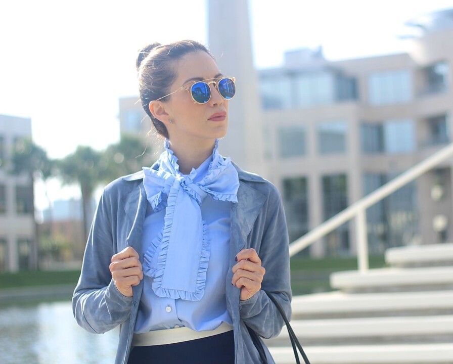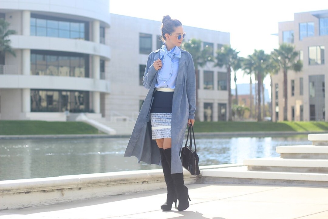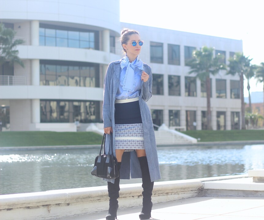 El trench es muy versátil porque puede llevarse sobre cualquier veatimenta y estilo. Hoy en dia, el trench de ante se ha convertido en una fuerte tendencia, las pasarelas están llenas de este tipo de prenda. Incorporé elementos femeninos, como una blusa con un moño y una falda lápiz estampada. Esta blusa es una de mis favoritas porque integra un increíble toque visual al conjunto entero. Como podras haber notado en la mayoría de los looks que suelo llevar, adoro todo tipo de acentos dulces para realzar mis conjuntos.