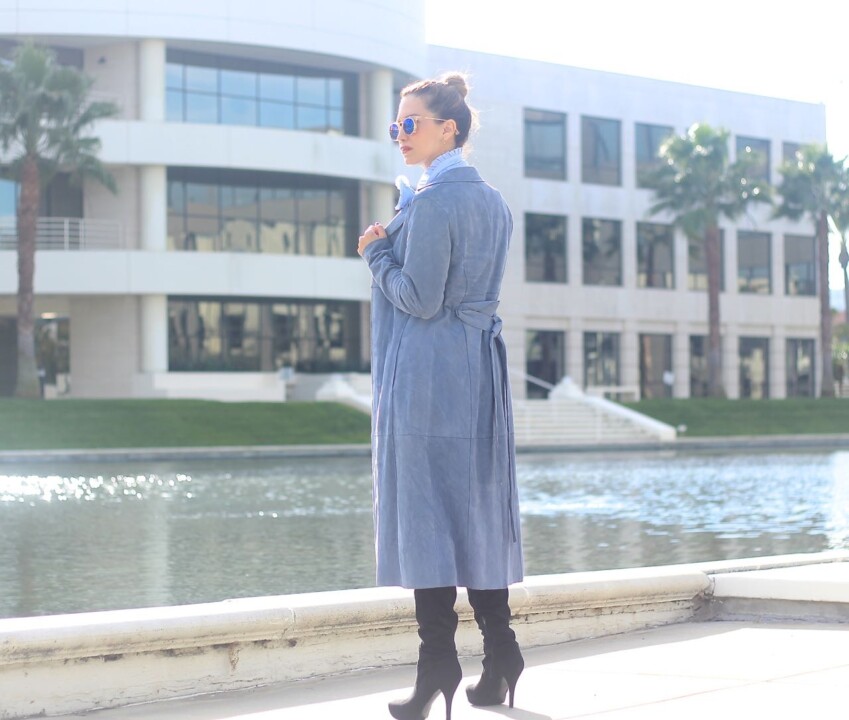 I’m wearing a wonderful suede trench in a lovely color, great to wear during Fall-Winter. It’s a stylish piece that adds flare to your look. You can belt it or tie it on the back, just how I did, to let the rest of the pieces I’m wearing be seen. A suede trench is versatile, it can work with any outfit and style. Suede is becoming a strong trend, the runways are full of it.